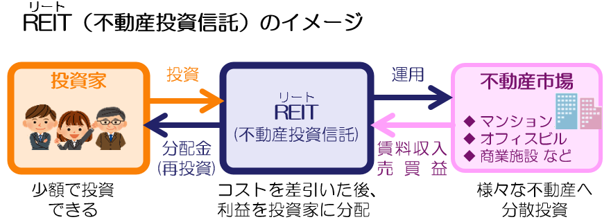 一般の不動産投資では、多額の資金が必要になりますが、投資信託では多くの投資家から資金を集めるため、少額で投資することができます。マンションやオフィスビル、商業施設など複数の不動産へ分散投資し、賃料収入や売買益が投資家へ分配されるしくみです。