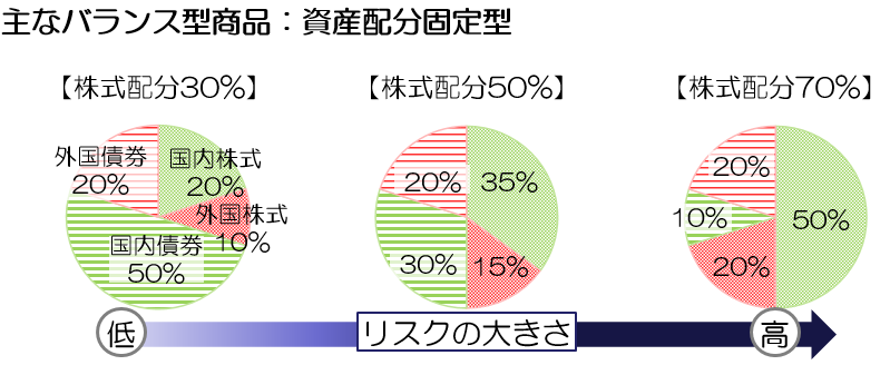バランス型にはいくつか種類がありますが、最も多いのは4資産(国内株式・外国株式・国内債券・外国債券)へ投資するものです。そのなかでも、債券を中心にリスクを抑えて投資するものや、株式を中心に積極的に投資するものがありますので、自身のリスク許容度に合ったものを選ぶようにしましょう。