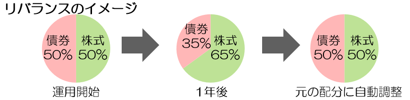 バランス型投資信託の代表的なものとして資産配分固定型というタイプのものがあります。運用を続けていると収益の違いから資産の比率にズレが生じ全体のリスクが高まることがありますが、資産配分固定型では定期的に元の比率に自動調整(リバランス)し、リスクを一定に保つちます。