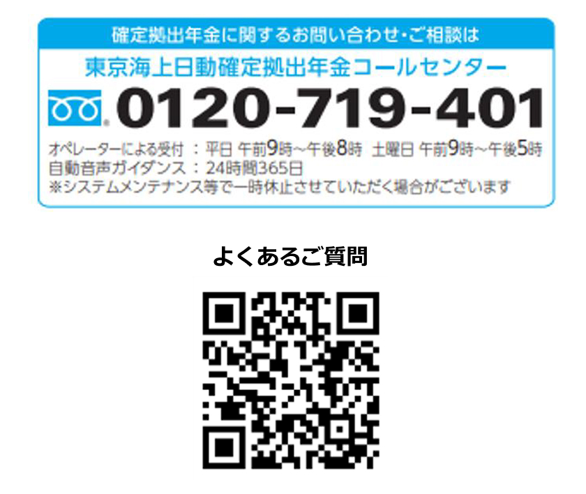 「もっと詳しい説明を聞きたい!」という方は、東京海上日動確定拠出年金コールセンターまでお気軽にご連絡ください。専門のオペレーターがお客様の知識やご経験にあわせてわかりやすくご説明します。また、コールセンターへのよくあるご相談内容は、下記二次元コードからご確認ください。
