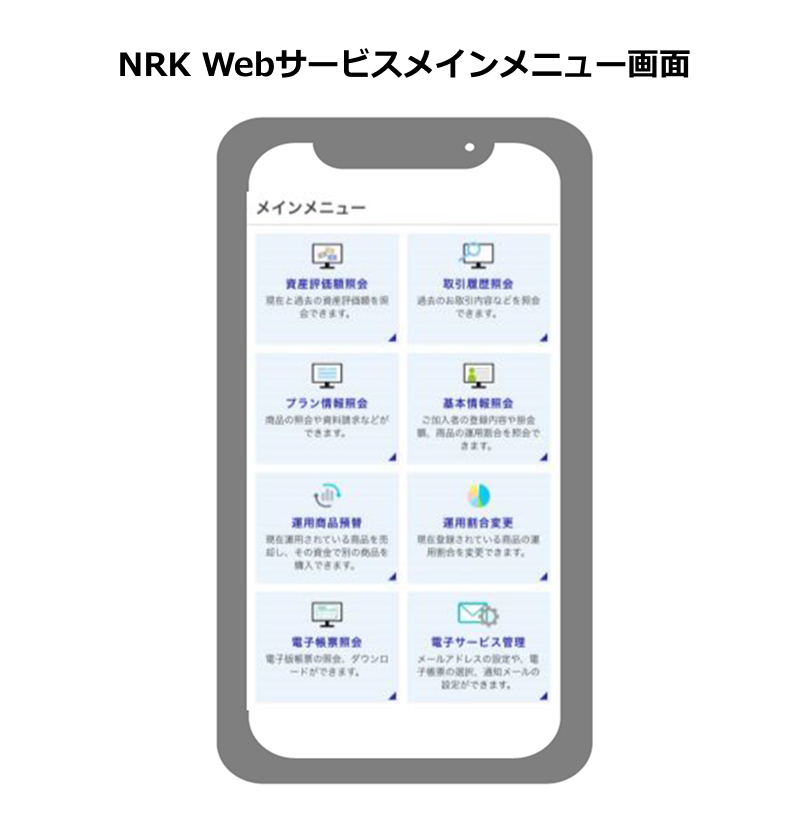 NRKが運営するWebサービスでは、DCの登録・加入プラン情報の確認や運用商品の変更手続き、そしてDCで積み立てた資産を60歳以降に受け取る手続きなどができます。