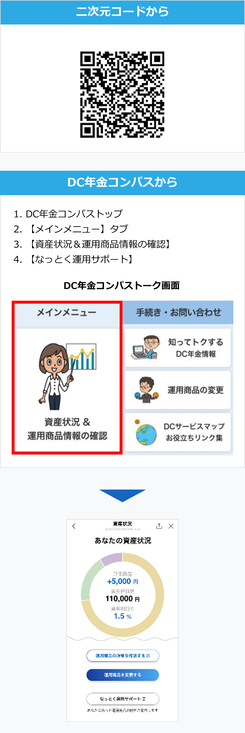現在保有している運用商品はわかったけれど、「もっと運用商品について知りたい!」、「どんな商品を選べばいいかアドバイスが欲しい!」という方は、資産配分シミュレーションツール「なっとく運用サポート」をご活用ください。