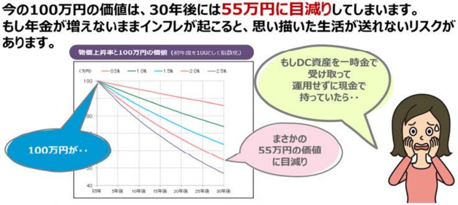 DC年金資産を一時金で受け取って、自分で運用した場合、利益に対して約20%の課税が発生しますが、税制優遇があるDC年金資産にそのまま置いておく場合、運用益非課税であるため、より効率的に資産の延命をすることができます。