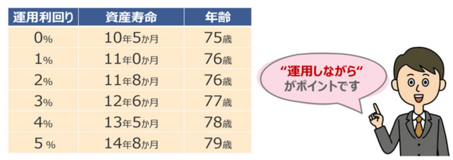 以下は、65歳時点で1,000万円ある資産を、毎月8万円ずつ取り崩した場合です。全く運用しなければ、10年5か月で資金が枯渇しますが、運用することでお金の寿命を延ばすことができます。