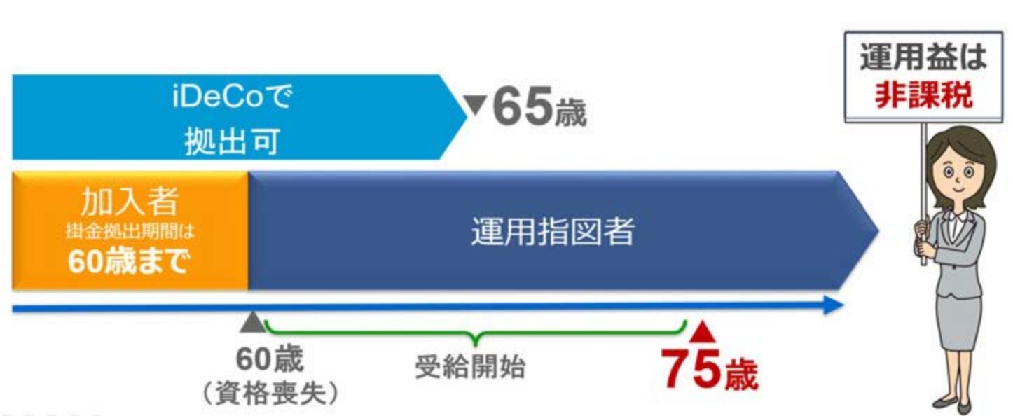 DC年⾦資産は、最⼤で75歳まで運⽤を続けることができ、そこからさらに20年間にわたって、年⾦受取りも可能です。また、60歳以降でも条件によりiDeCoで掛⾦をさらに積⽴てて増やしていくことも可能です。