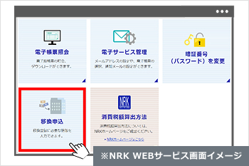 該当するご加入者のみ、今回加入する企業型DCへ資産を移す手続きを行います。「NRK WEBサービス」にアクセスし、メインメニューから[移換申込]をタップします。