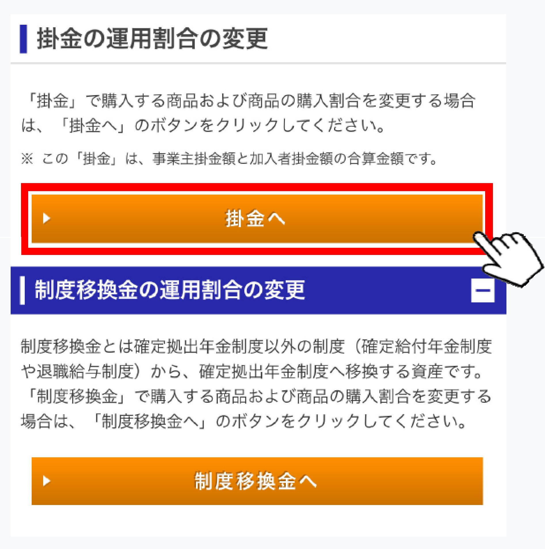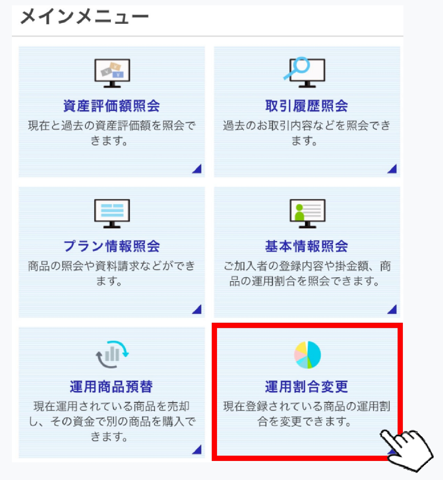 初回掛⾦拠出⽇の3営業⽇前24時までに、以下の運⽤割合変更の⼿続きを完了する必要があります。