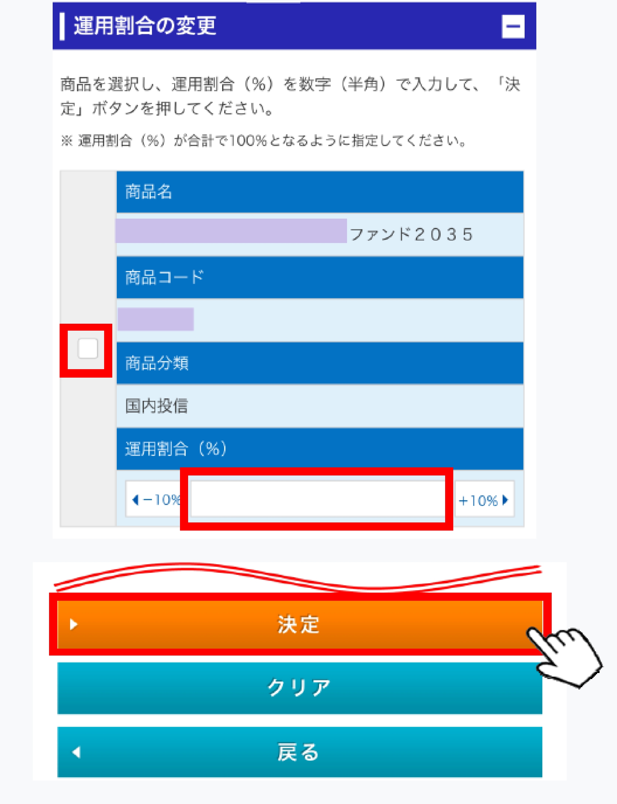運⽤商品を選定(該当商品にチェック)し、割合(合計100%)を⼊⼒し[決定]をタップ
