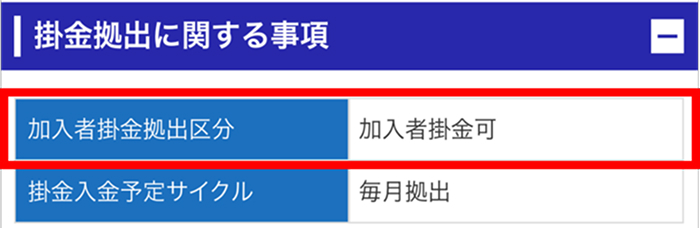 掛⾦拠出に関する事項を確認することができます。加⼊者掛⾦拠出とは、マッチング拠出のことで、事業主が拠出する掛⾦に加⼊者が上乗せ拠出をできる制度のことです。