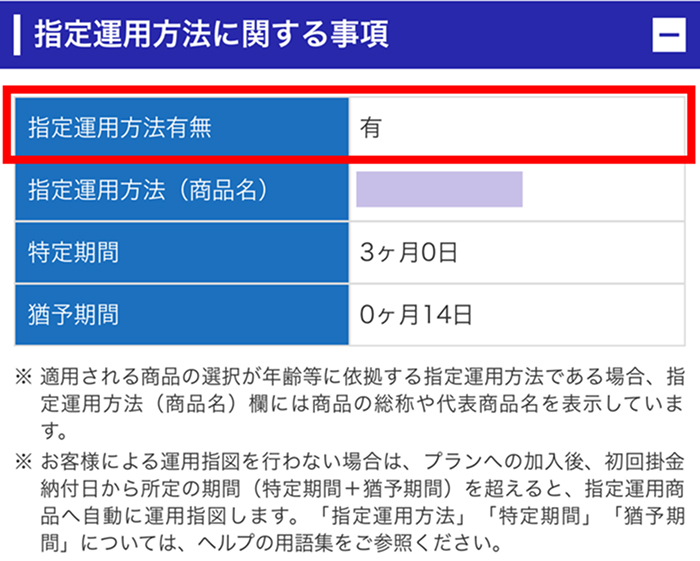 会社の制度によって、指定運⽤⽅法を定めている場合があります。指定運⽤⽅法とは、「特定期間」(通常3か⽉)の間に運⽤の指図がない場合、⾃動的にあらかじめ定められた「指定運⽤⽅法(運⽤商品)」を100%購⼊していく、とする⽅法です。